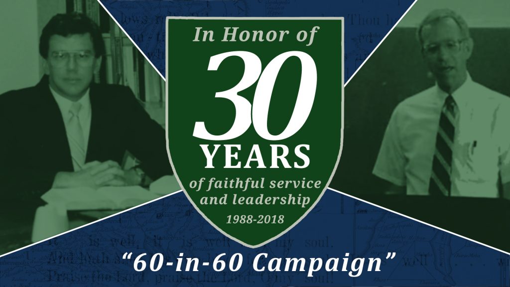$60,000 in 60 Days – A Special Campaign to honor President Brown and Vice President Ross On September 30, 2018, President Steve Brown and Vice President Wes Ross retired from full-time leadership of the Berkshire Institute for Christian Studies after thirty years of faithful service. They piloted the Institute from its inception in 1988 and